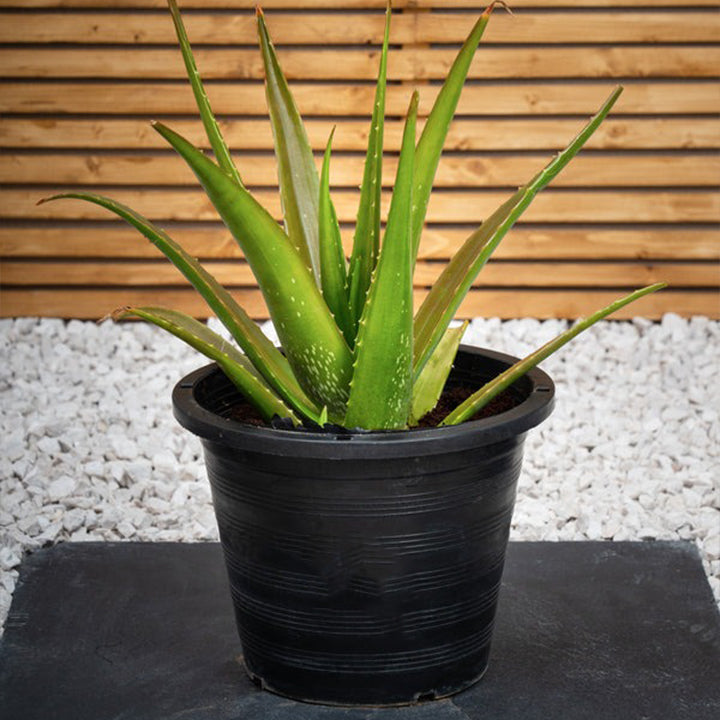 Aloe Vera is a succulent plant that is known for its medicinal properties. It is a perennial plant that can grow up to 30cm to 60cm in height. The plant has thick, fleshy leaves that are green in color and are arranged in a rosette pattern. The leaves are serrated and have small white teeth along the edges.